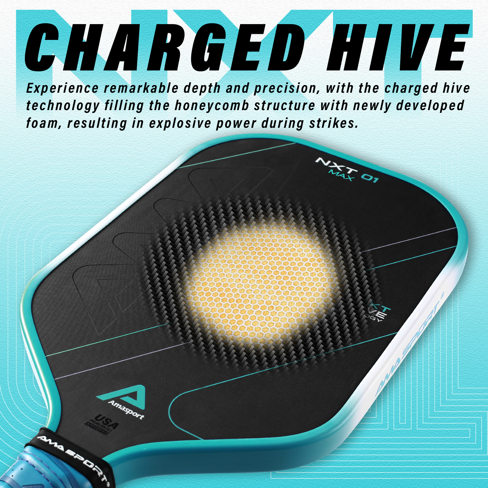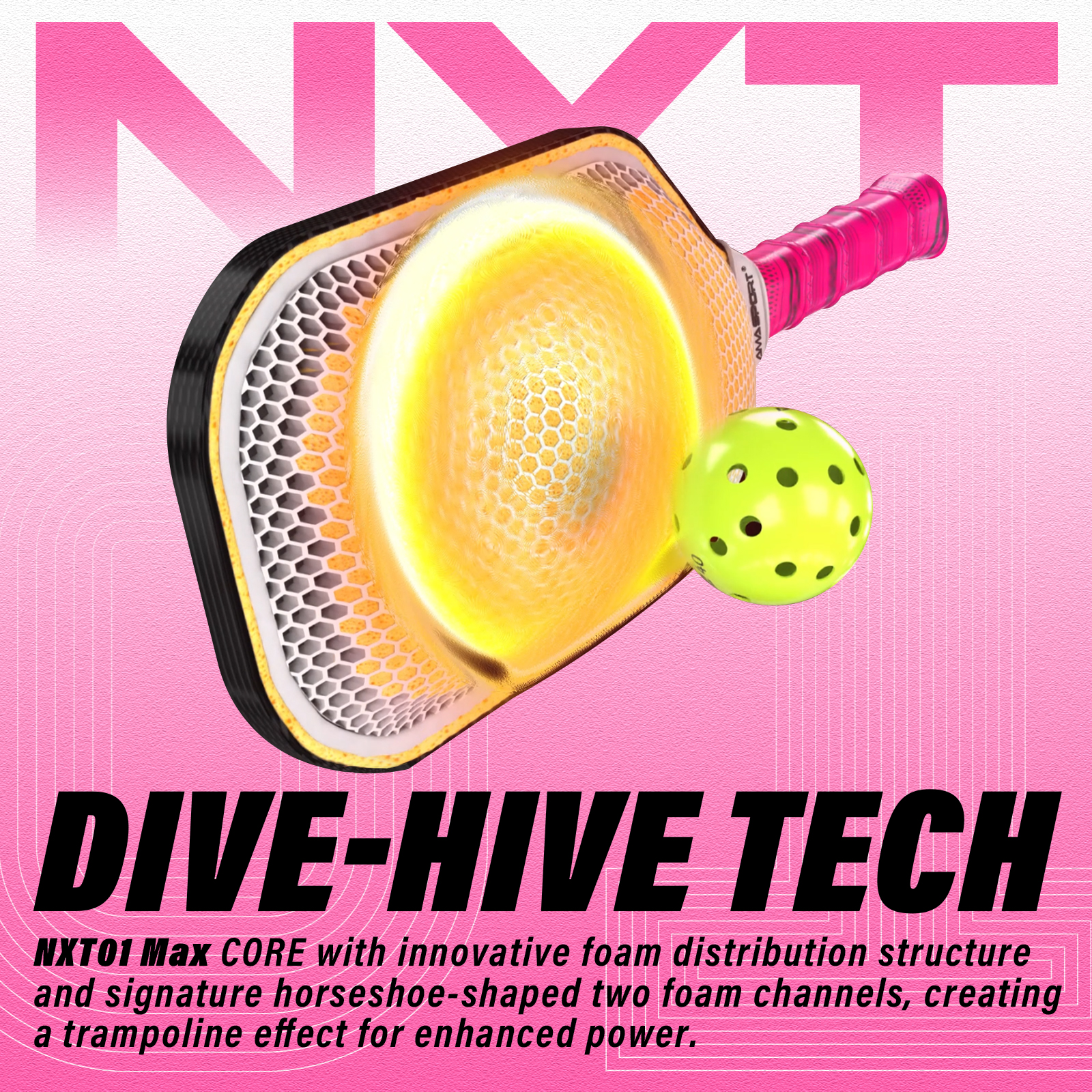 Engineered to perfection, our NXT01 Max CORE leverages the revolutionary DIVE-HIVE technology to deliver a perfect balance of deep impact, explosive power, and unmatched control, ensuring every shot reaches new heights. Experience remarkable depth and precision, with the charged hive technology filling the honeycomb structure with newly developed foam, resulting in explosive power during strikes. Effortlessly dominate the court with exceptional control on every shot, from powerful drives to delicate dinks.